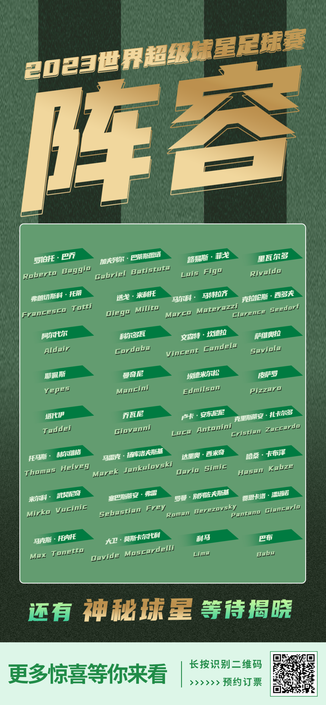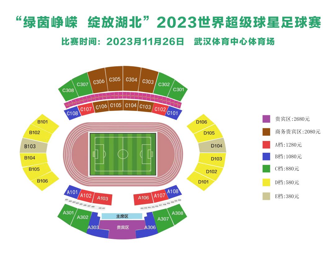 2023世界超级球星足球赛球票今天起已经可以开始预约,11月1日14:58在大麦网正式开始预售,票价分为7种,从380元到2680元不等。球迷可以前往大麦网购票。