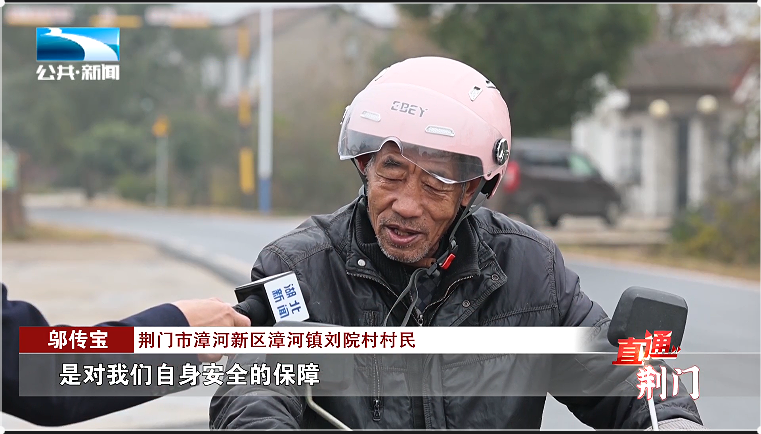 荆门市漳河新区漳河镇刘院村村民 邬传宝:“交警宣传我们要戴头盔,(送)给了我们头盔,现在不管(骑车去)干什么,都要把头盔戴上,是对我们自身安全的保障。”