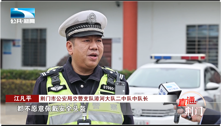 荆门市公安局交警支队漳河大队二中队中队长 江凡平:“农村地区老年人骑乘人员都不愿意佩戴安全头盔,我们漳河交警大队经常进行入村宣传,为老年人骑乘人员送上安全头盔,保障他们的安全。”