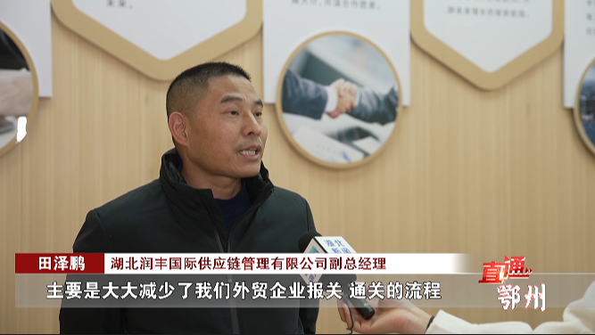 湖北润丰国际供应链管理有限公司副总经理 田泽鹏:“平台的开通,主要是大大减少了我们外贸企业报关通关的流程,我们可以及时了解国际贸易的市场动态、价格行情,以及货物动态,我们整个企业在市场运营的效率有了大大提高。”