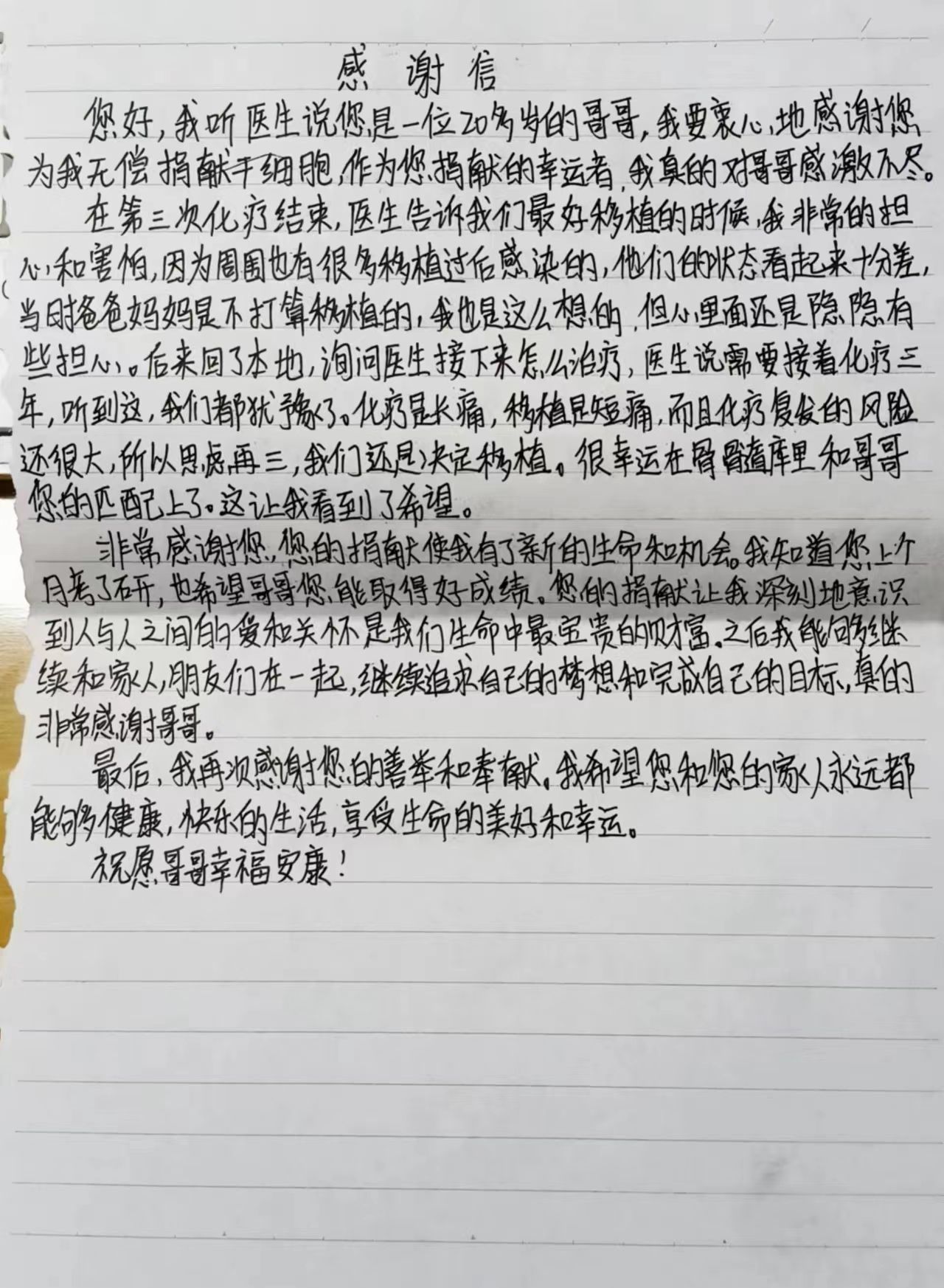 捐献前夕,李智收到了患者的一封感谢信,信中写道:“非常感谢您,您的捐献使我有了新的生命和机会。我知道您上个月考了研,也希望哥哥您能取得好成绩。您的捐献让我深刻地意识到人与人之间的爱和关怀是我们生命中最宝贵的财富。也正是有您这样救人的英雄,让我的生命得到了延续。”