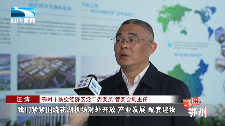 鄂州市临空经济区党工委委员、管委会副主任 汪涛:“我们紧紧围绕花湖机场对外开放、产业发展、配套建设、破解难题,五横六纵骨干路网初步成型,临空实验学校投入使用,市公共卫生和临床中心、星级酒店投入试运行,湖北内陆对外开放‘空中出海口’已初具雏形。”