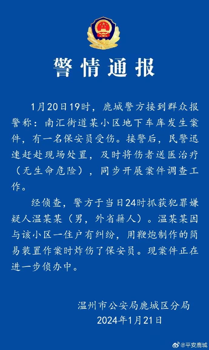 温州警方通报“某小区1名保安被炸伤 ”:犯罪嫌疑人已被抓获