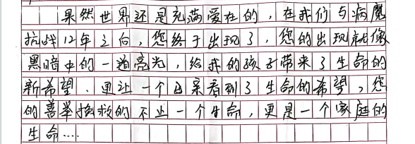 捐献结束后,李倩收到了患者家属的感谢信,信中写道:“您的出现就像黑暗中的一道亮光,给我的孩子带来了生命的新希望,更让一个母亲看到了生命的希望……”