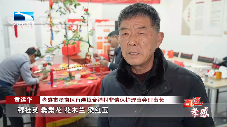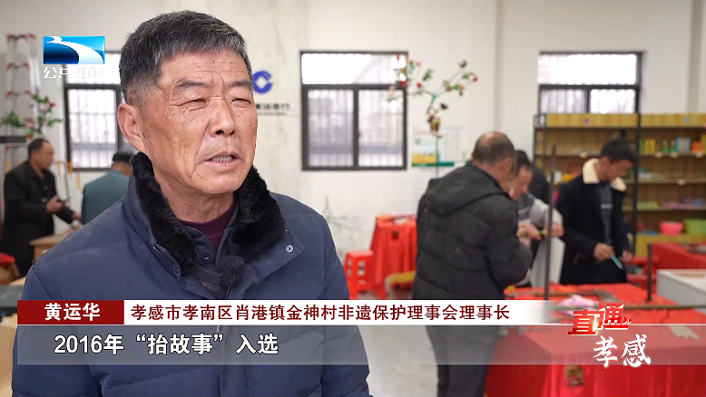 孝感市孝南区肖港镇金神村非遗保护理事会理事长 黄运华:“‘抬故事’这门手艺涉及多种门类,需要掌握剪纸、彩绘、泥塑等多种技艺,各类演员的妆造,文生、武生、青衣、花旦的服装匹配等,2016年‘抬故事’入选,湖北省第五批非物质文化遗产名录。”