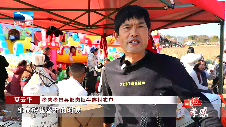 孝感孝昌县邹岗镇牛迹村农户 夏云华:“邹岗梅花盛开的时候,给我们农副产品带来了很大的效益,我们在春节这段时间,销量非常好。”