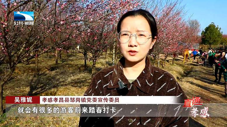 孝感孝昌县邹岗镇党委宣传委员 吴雅妮:“我们的这个生态梅园从2015年开始打造,现在已经成为了孝昌最大的苗木基地和孝感最大的红梅观赏基地,每年春节期间,就会有很多的游客前来踏春打卡。”