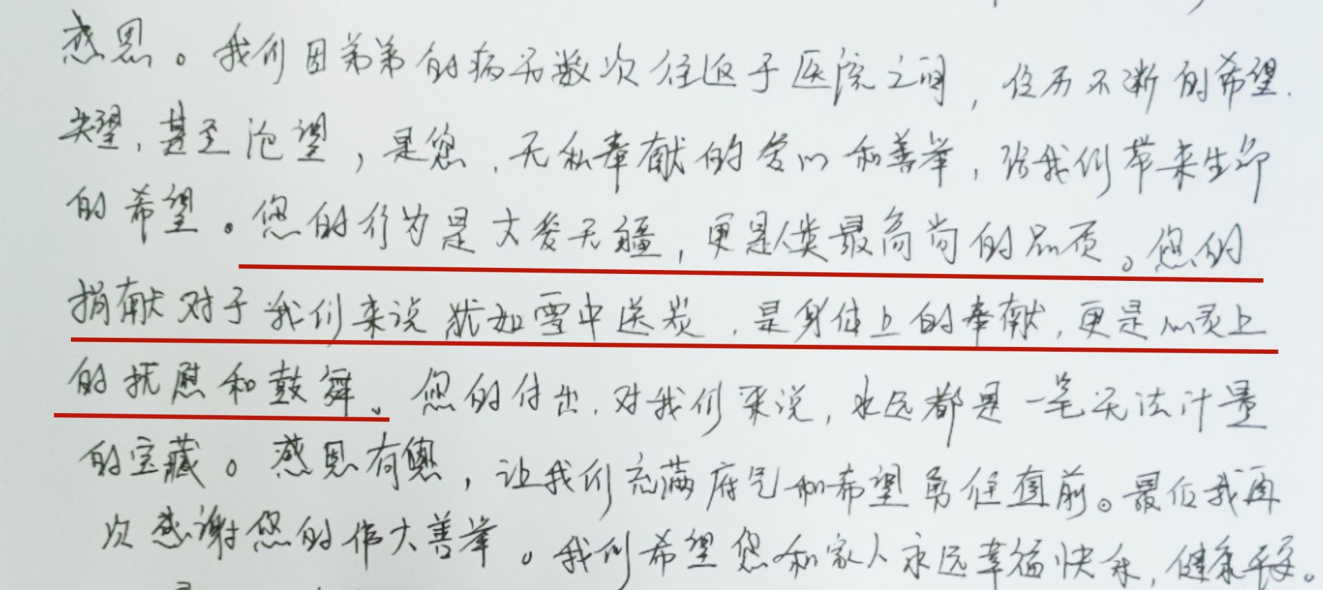 3月1日下午,经过4个多小时的采集,郝先生顺利结束捐献。他还收到了患者家属寄来的感谢信,信中写道:“您的捐献对于我们来说犹如雪中送炭,是身体上的奉献,更是心灵上的抚慰和鼓舞。”