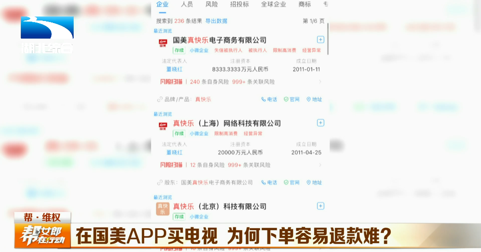 门店工作人员告诉帮女郎,国美电器的线下门店和网店隶属不同的公司主体,他们现在只能处理在武汉市内线下购买的订单,而国美网店是“真快乐”公司负责。帮女郎在企查查APP上看到,与“国美真快乐”有关的公司共有三个。两家注册地在上海,一家在北京,上海的两家都显示为经营异常的状态。