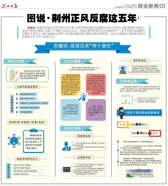 自荆州市第四次党代会以来,特别是党的十八大以来,该市层层压实“两个责任”,旗帜鲜明正风肃纪,坚定不移惩治腐败,党风廉洁建设和反腐败工作取得明显成效。为系统反映五年来全市正风反腐工作情况,该市纪委精心组织,采取喜闻乐见的“图说”形式,在该市主要媒体推出系列报道。