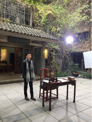 主持人姜剑在拍摄间隙背台词