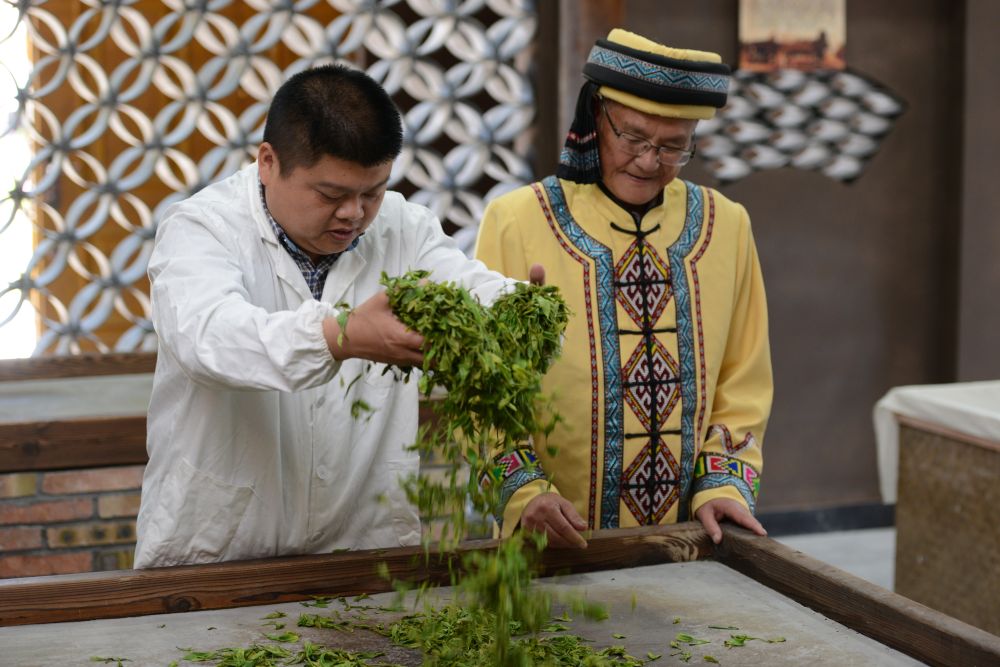 国家级非遗绿茶(恩施玉露)制作技艺传承人杨胜伟(右)和蒋子祥一起做手工恩施玉露。(恩施州茶产业协会供图)