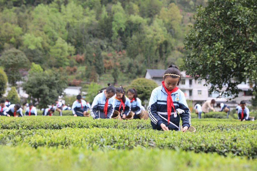 4月8日,利川市忠路镇民族小学学生变身“小茶农”采摘茶叶。 (张宝训 摄)