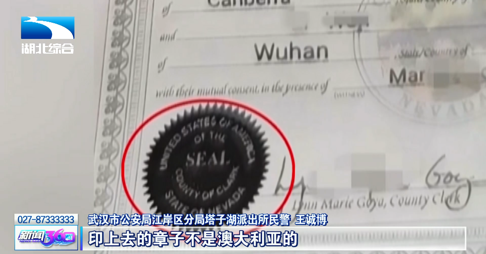 民警发现,这张所谓的“澳大利亚结婚证明”,上面印的不是澳大利亚的公章,而是美国的公章。