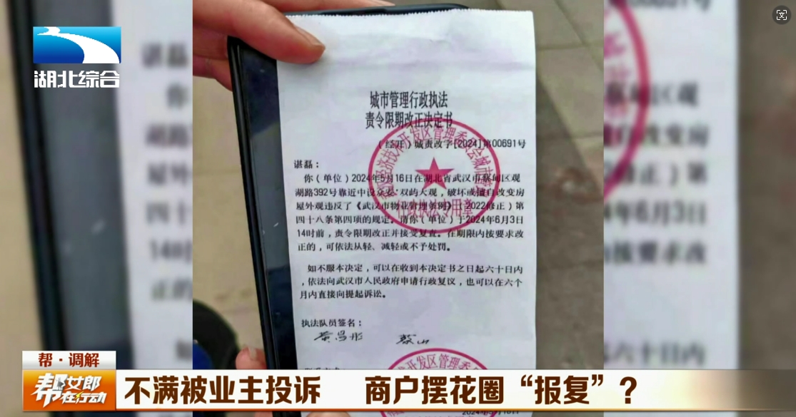 随后,帮女郎来到辖区城管执法中心,工作人员表示,此前,他们接到业主投诉,并在5月16日,以擅自改变房屋外观为由,对两间商铺下达了责令限期改正决定书,而摆花圈、设灵堂就是在城管下令整改后才出现的。“她如果不整改,我们是会按照《物业管理条例》或者《违法建设条例》对她进行罚款,还要申请法院强制执行,还要强制恢复的。”