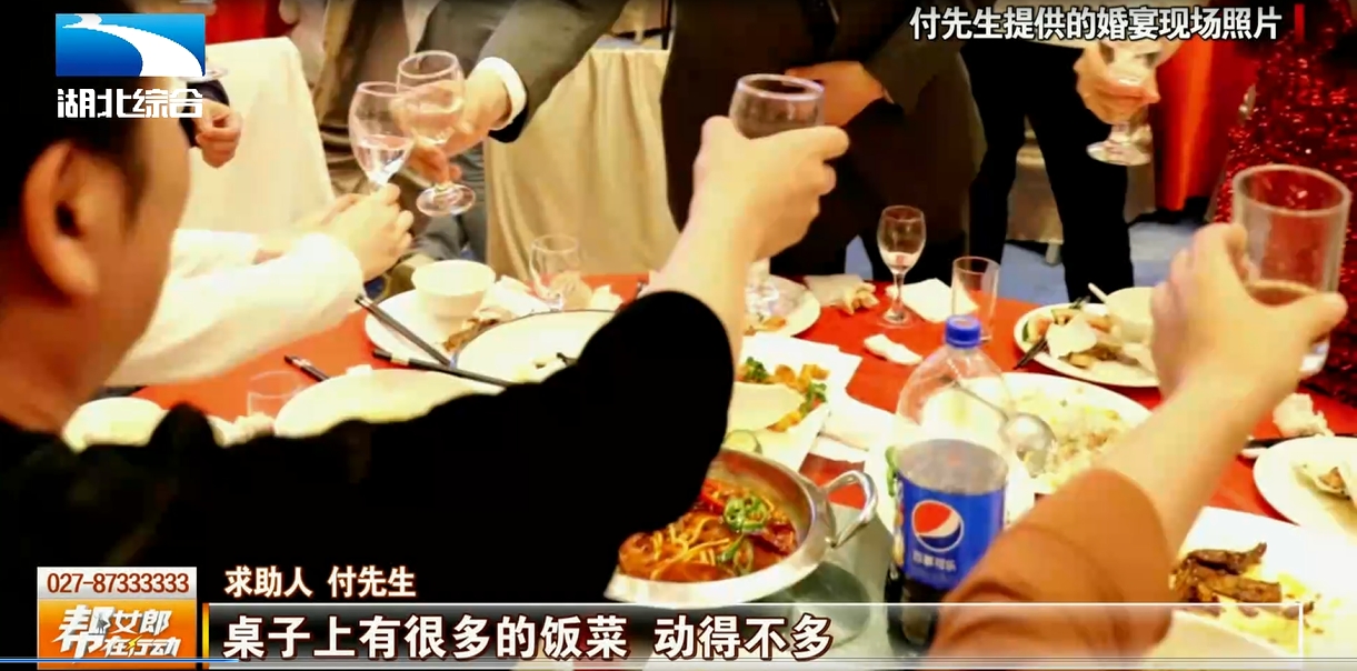 随后,付先生通过打电话的方式询问宾客,付先生的朋友们表示对这次的婚宴很失望,“服务我们一直叫,想喝酒,酒被收起来了,这蛮尴尬;色香味一样都没占上,像小餐馆的菜一样,不像大宾馆的菜,我跟我儿子吃了一半走了。”