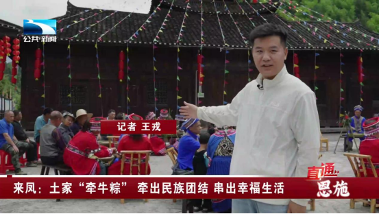 记者 王戎:“端午节作为土家族人民最为隆重的节日之一,非常有仪式感。在我身后,张灯结彩的吊脚楼前,齐聚着各村的村民们,共同来包一‘绳’粽子,这个叫牵牛粽。”