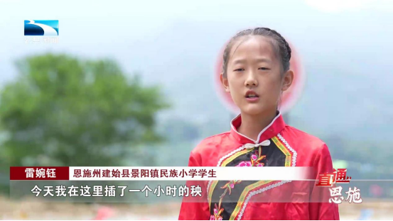 恩施州建始县景阳镇民族小学学生 雷婉钰:“今天我在这里插了一个小时的秧,知道了农民伯伯地辛苦劳动是很不容易,我以后每次吃饭都要吃多少打多少,绝对不能浪费一粒粮食。”