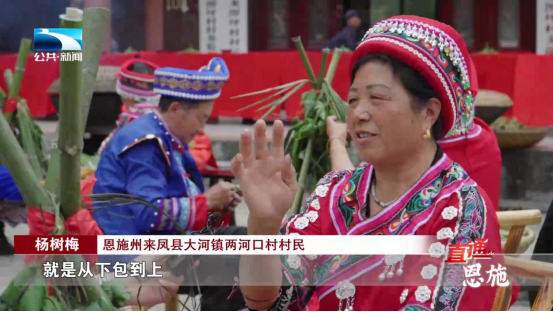 恩施州来凤县大河镇两河口村村民 杨树梅:“就是从下包到上,包的牵牛粽,一根绳子可以包几十个,希望我们的生活像粽子这样的节节高。”