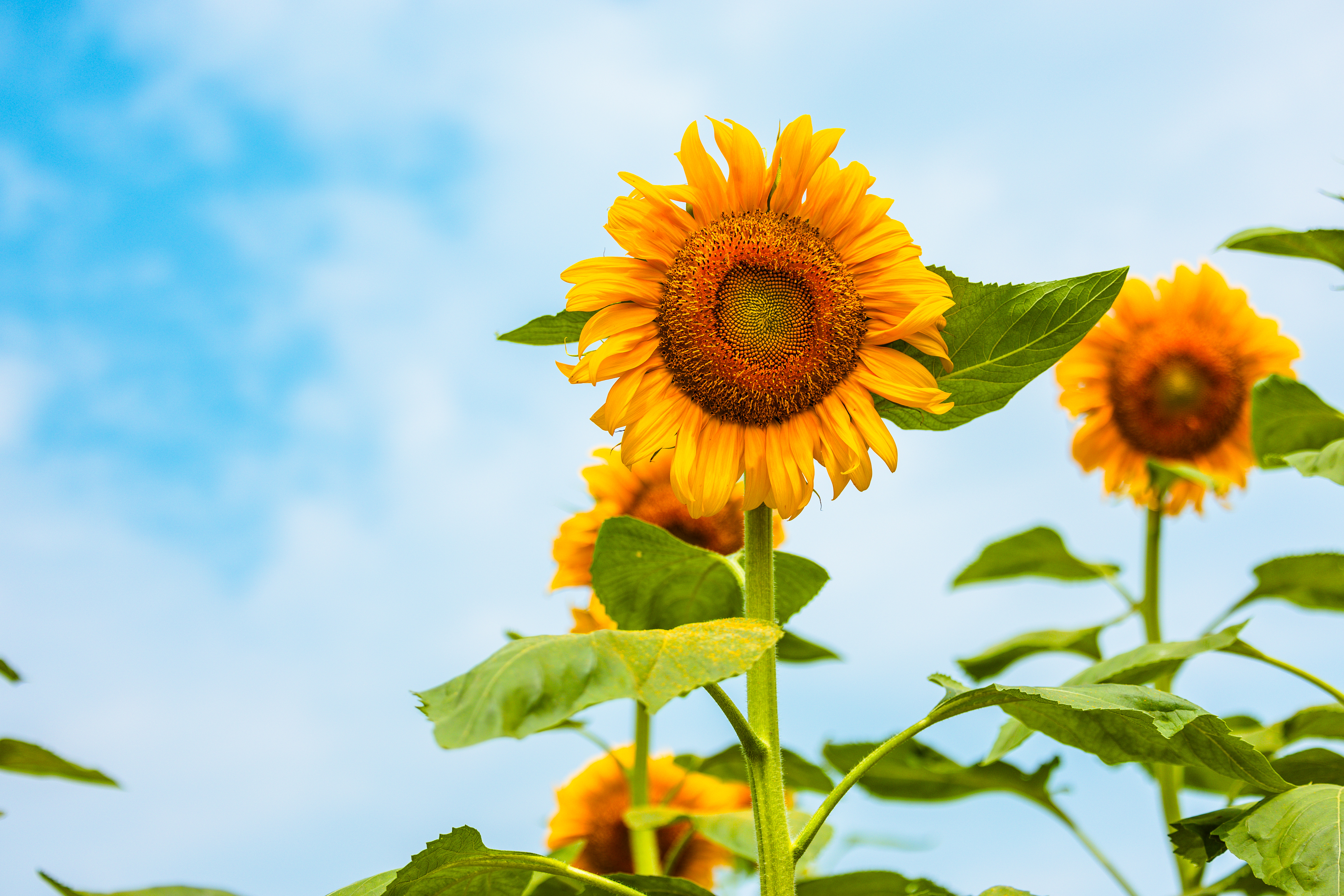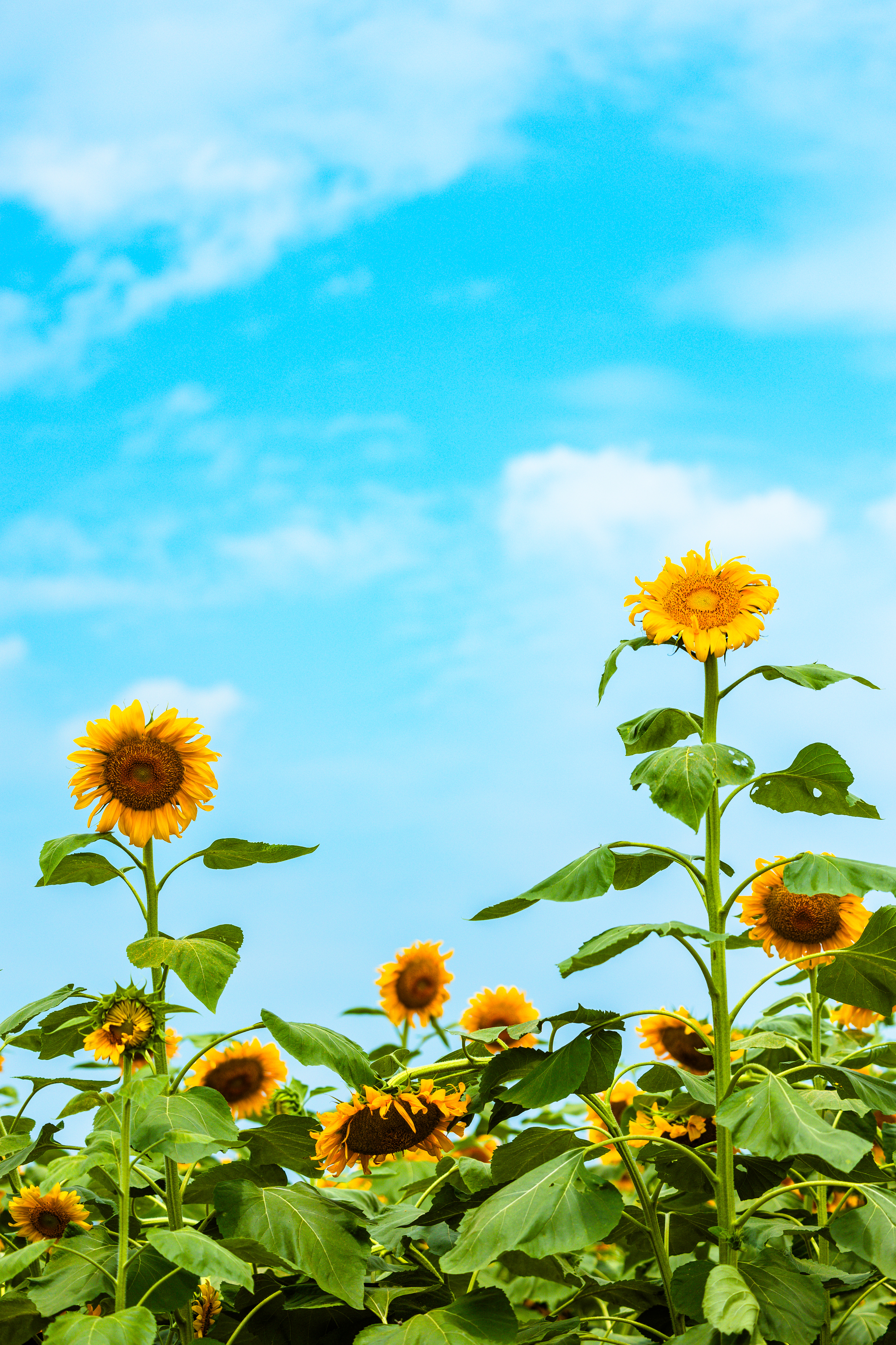阳光灿烂,天空湛蓝。向日葵随风摇曳,似在舞蹈又似在诉说。