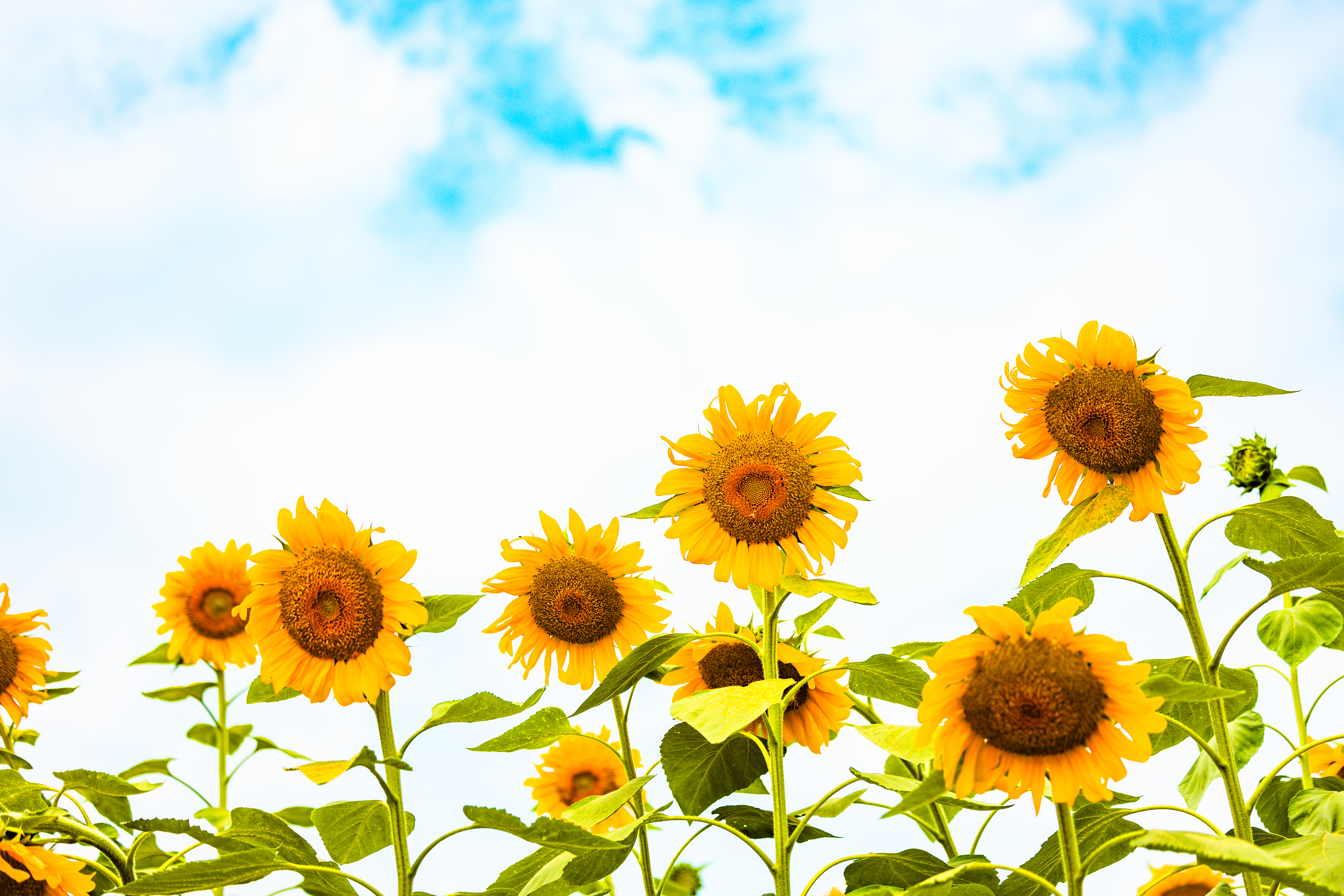 绿野碧空之间,金灿灿的向日葵高低错落,花盘又大又圆,如同一轮金色的太阳,为夏日的乡村增添一抹亮色。