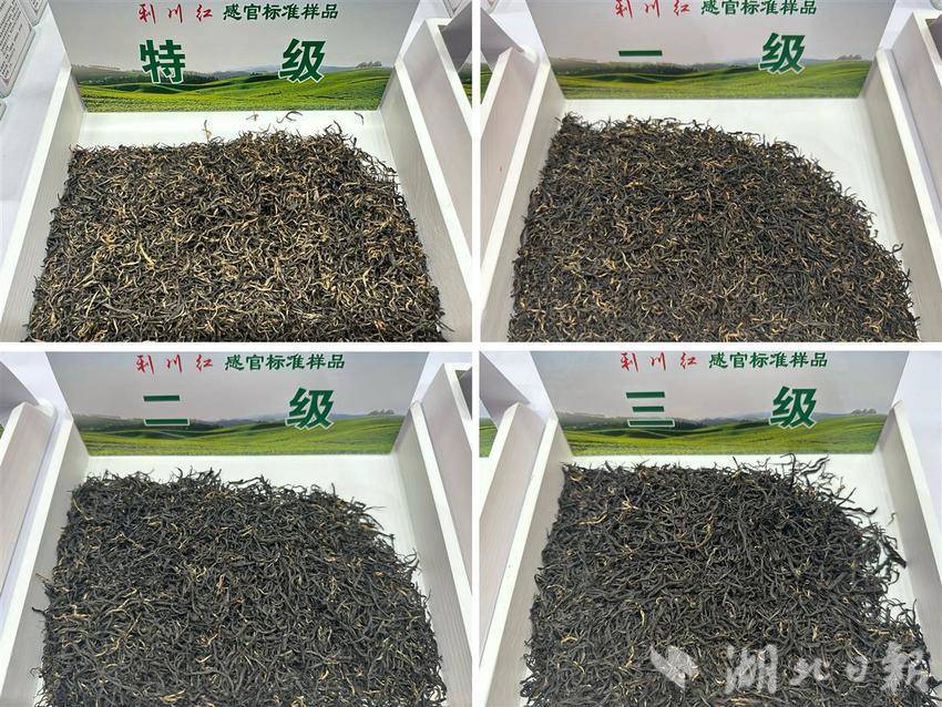 记者现场看到,利川红4个等级的茶样对比明显,特级茶不仅乌黑油润,还有丰富的金毫;一级的金毫减半,二级、三级仅有零星金毫。