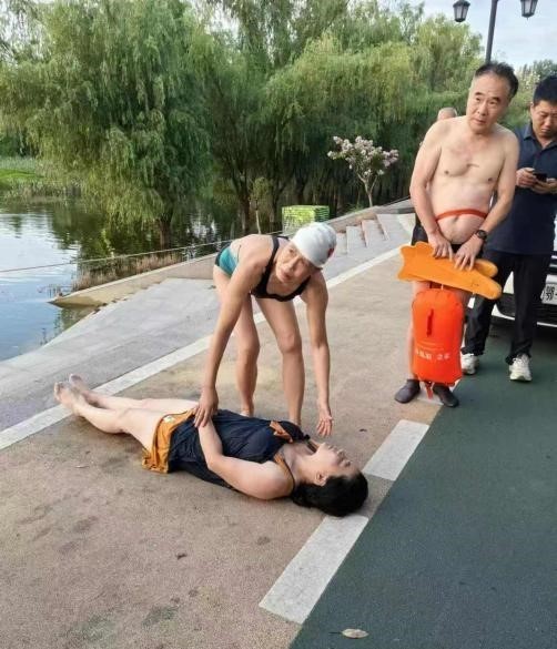 此时,正在岸边值守的石玉莲教练闻讯,立即带领队员吴耀军奔向溺水现场。二人毫不犹豫跳进水中相救,奋力托起溺水者,小心翼翼地送上岸边,张警官在岸边接应,众人合力把该女子抬至救护车上接受救治,在场群众纷纷为他们点赞。