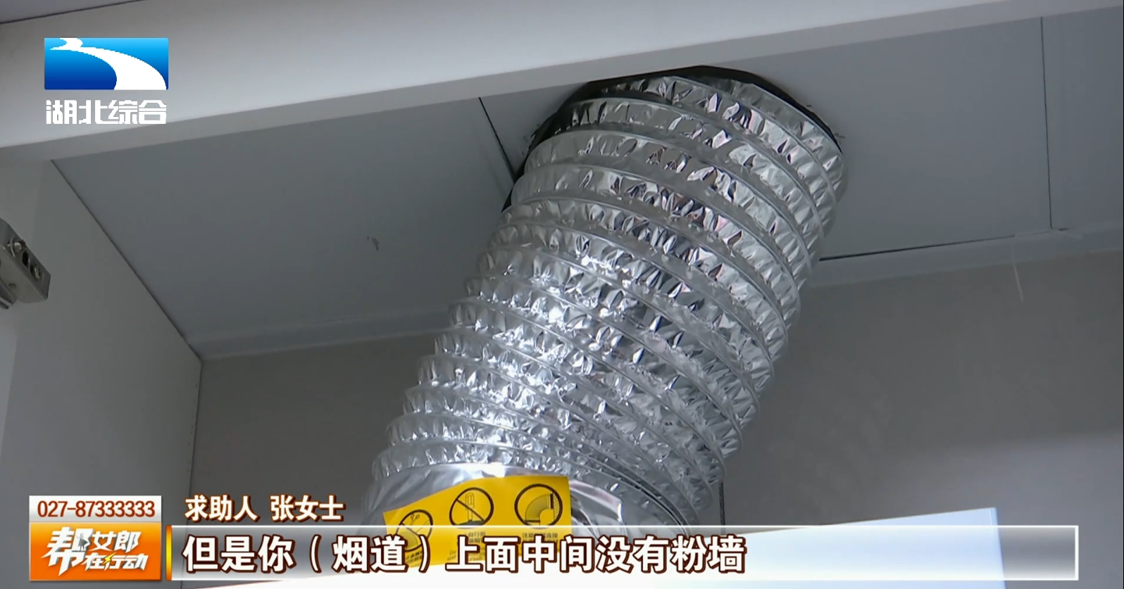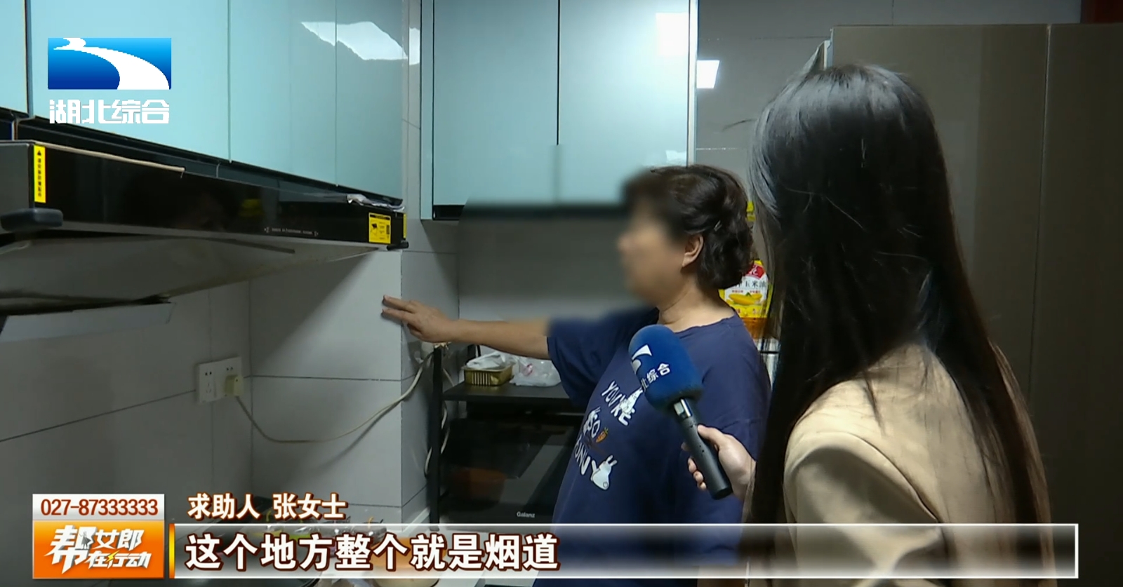 张女士家住武汉市汉阳区都市兰亭小区。张女士说,前年她把家里重新装修了一次,去年5月份正式入住,刚一住进来,她就发现家里一到饭点全是油烟味,起初她怀疑是抽油烟机出了问题,“我就一直找抽油烟机的维修人员,师傅到我家来了3次,他说肯定不是抽油烟机的问题。他上去看了后说:'你烟道这边都贴了瓷砖,但是你烟道上面没有粉墙,有缝隙,烟子就会出来'。”