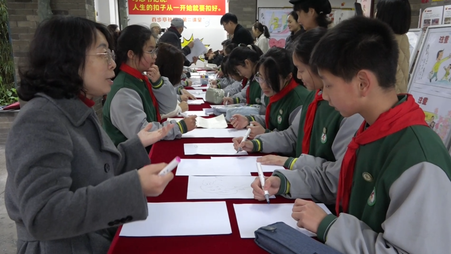 王景民带领孩子们画了一个扣扣子的漫画,让他们在画的过程中理解这幅画的含义。“因为第一颗扣子扣好了,你的人生道路才能走好。”