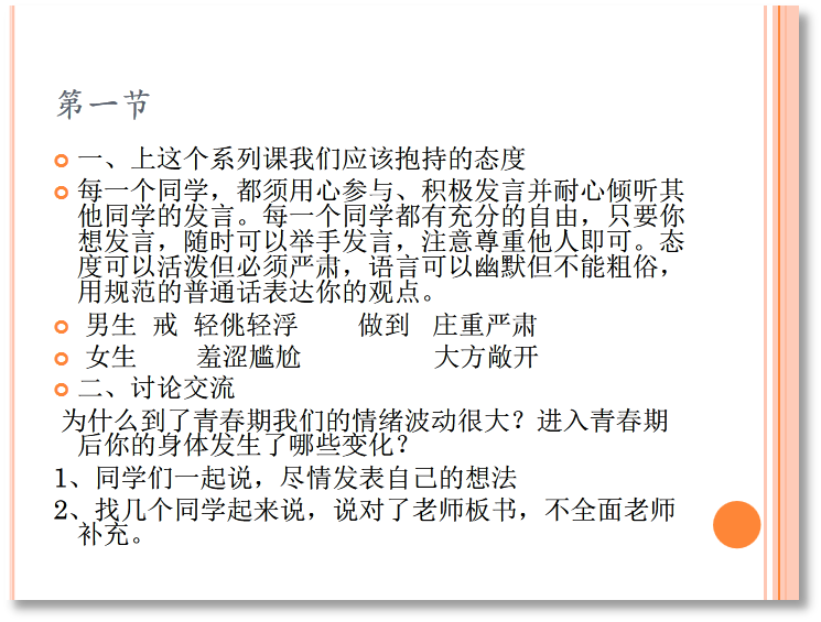 在活动之前,老师要重点强调上这个系列活动课的要求,这样才会使课堂活而不乱。然后,学生围绕问题发表自己的见解,为什么到了青春期我们的情绪波动很大?进入青春期后你的身体发生了哪些变化?