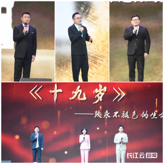 湖北广播电视台主持人江涛、田野、刘巍、刘俊、徐嘉珉、李小雷通过情景朗诵《十九岁》,深情讲述了三位19岁青年英雄的故事。吴焕先于巍巍大别山坚守革命火种,诠释了信念如磐的红色基因;梁力在迎战洪峰的险境中挺身而出,彰显了不畏艰险的抗洪精神;俞天阳投身没有硝烟的抗疫战场,展现了众志成城的科学担当。他们以19岁的生命厚度,在历史的坐标上刻下了“三大精神”最炽热的注脚。