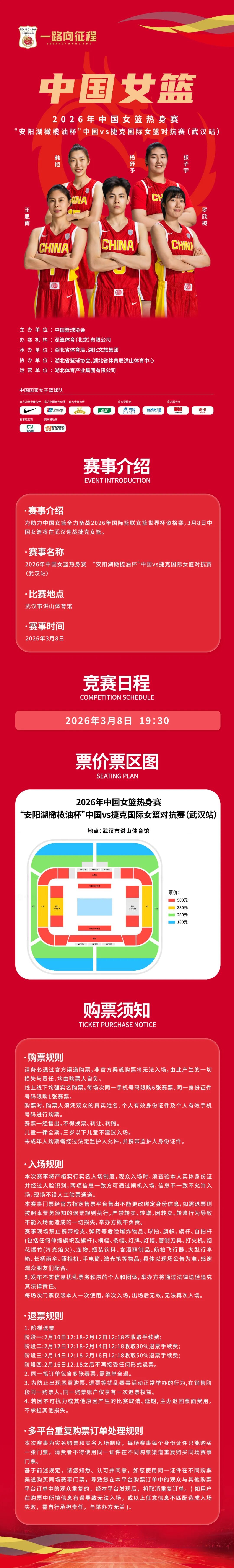 今日开票!2026年中国女篮热身赛“安阳湖橄榄油杯”中国vs捷克国际女篮对抗赛(武汉站)