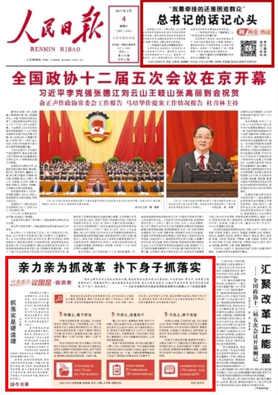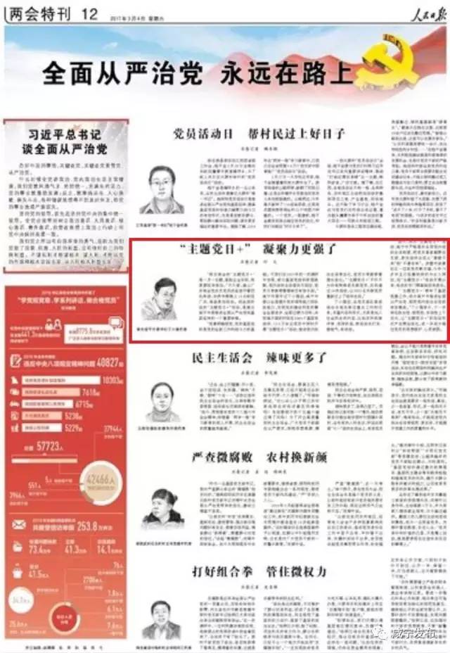 除了头版,今天的《人民日报》两会特刊以《“主题党日+” 凝聚力更强了》为题,对湖北咸宁推进全面从严治党向基层延伸的经验进行了报道。