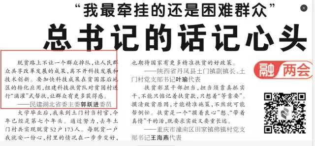 在《“我最牵挂的还是困难群众” 总书记的话记心头》一文中,民建湖北省委主委郭跃进委员关于扶贫的建议被摘录。