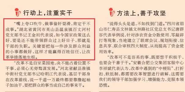 在《亲力亲为抓改革 扑下身子抓落实》一文,摘录了湖北省黄冈市英山县温泉镇百丈河村党支部书记王金初代表关于实干的说法。