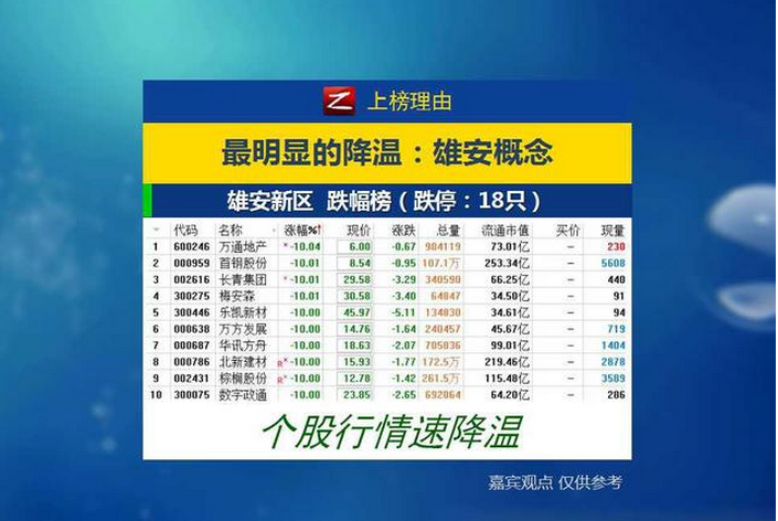 经过市场连续炒作过后,雄安概念板块昨日终于出现调整,走出明显降温的行情,值得关注的是虽然板块指数仅下跌1.04%,但有多达10只概念股跌停,雄安概念炒作降温的原因何在?这种现象的发生,向市场释放出何种信号?