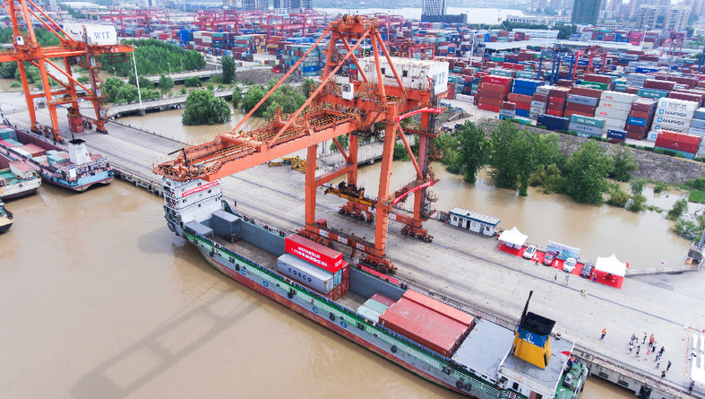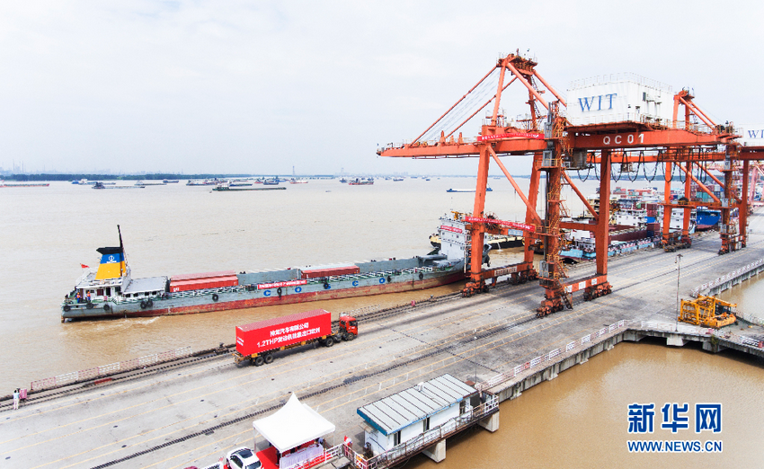 图为航拍长江中上游最大的集装箱码头——武汉新港阳逻集装箱港区 新华网 闵任之摄