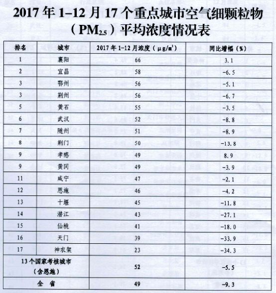 湖北2017全年空气质量排名公布 看你生活的地方排第几