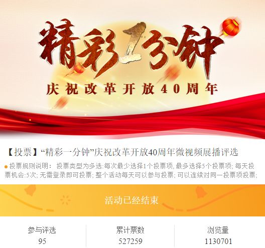 2018年12月24日——31日,湖北广电长江云平台推出“精彩一分钟”庆祝改革开放40周年微视频展播评选活动,评选期间,浏览量超100万,累计票数近53万