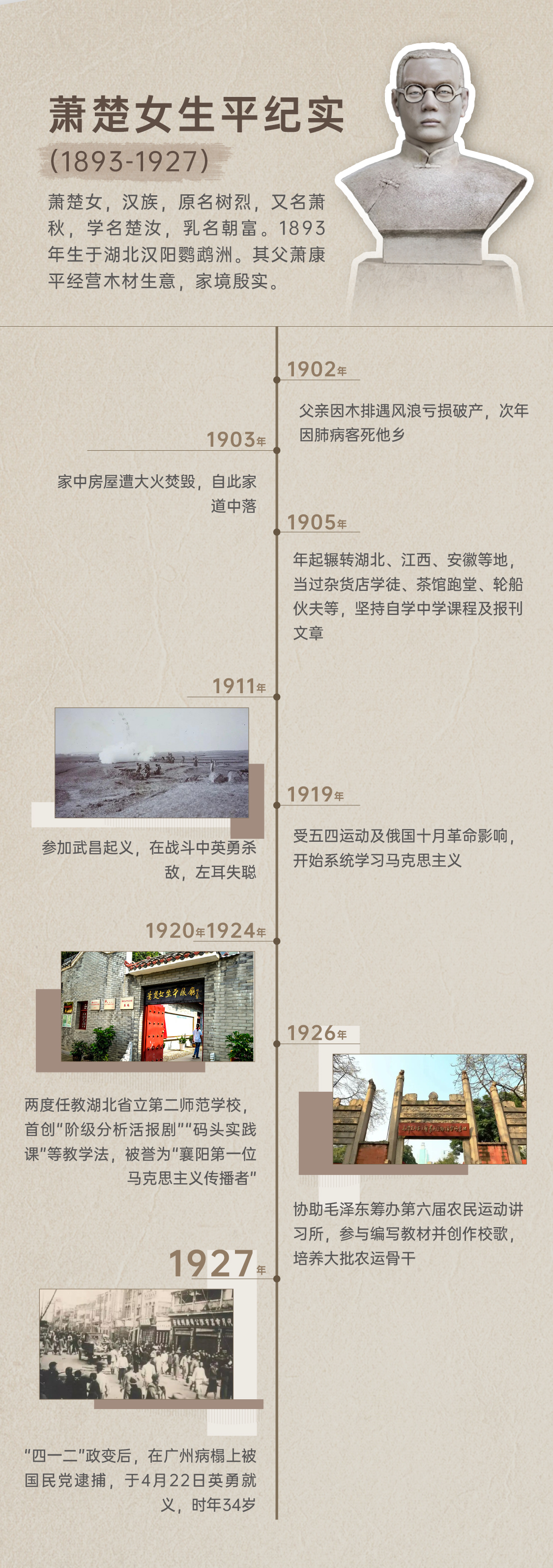 参加过辛亥革命的萧秋在《大汉报》和《崇德报》任编辑,经常发表进步文章,落款用“萧楚女”,楚指的就是湖北,女就是屈原《楚辞》中的神女。以“楚女”作笔名,是他借屈原的诗表达自己的爱国抱负。