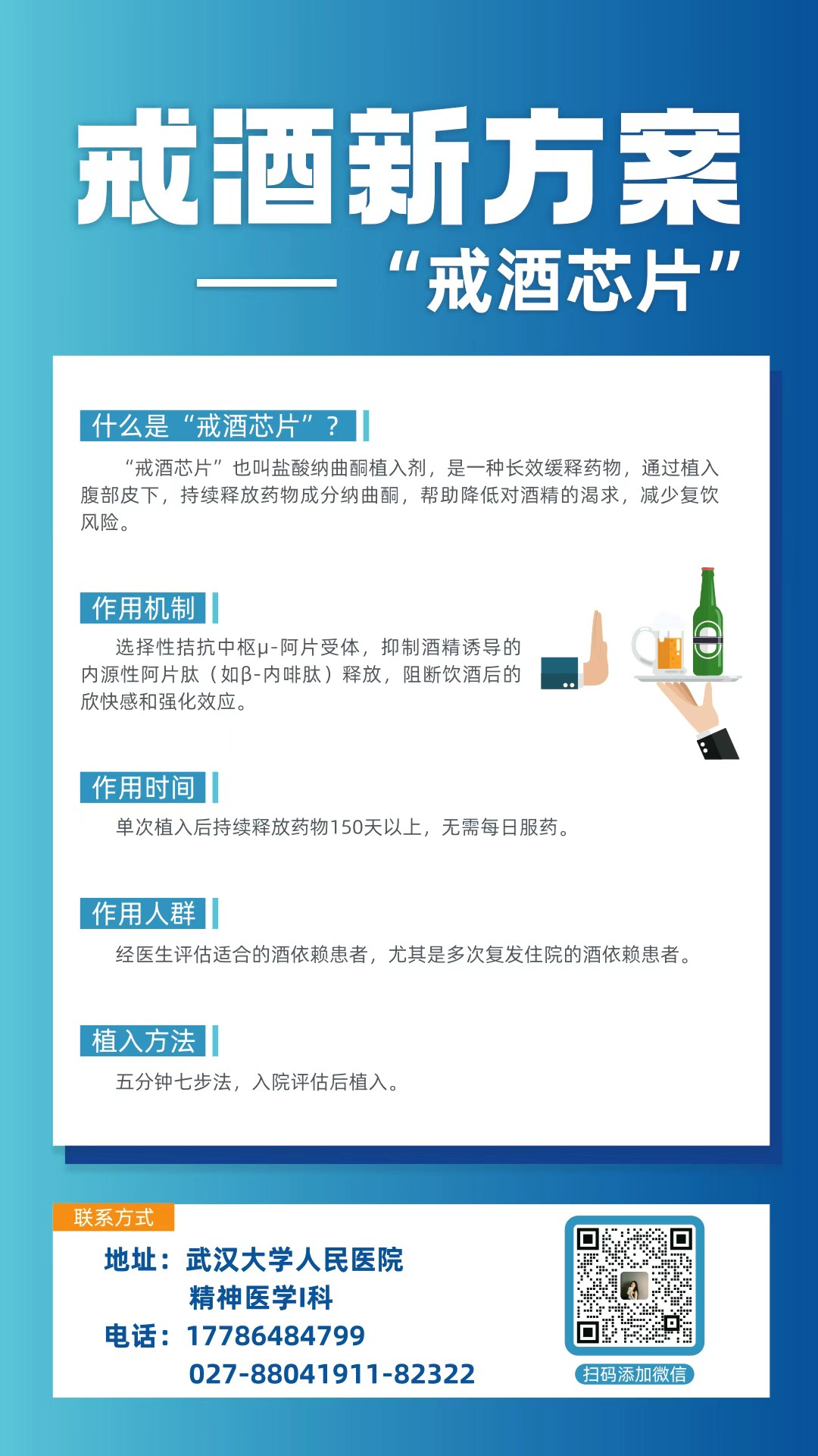 “戒酒芯片”治疗技术是武汉大学人民医院开展的新业务新技术项目,也是现阶段酒精依赖者防复饮的有效治疗技术。与传统的口服药物相比,盐酸纳曲酮植入术具有给药周期长、患者依从性好、植入快捷安全有效等优势,为酒精依赖患者提供了全新的戒断方案。整个治疗过程由精神科、肝胆外科、麻醉科多学科协作完成,手术植入过程仅耗时10分钟,药效可持续150天以上。