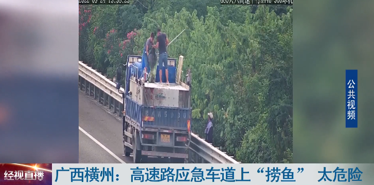 广西横州:高速路应急车道上“捞鱼” 太危险