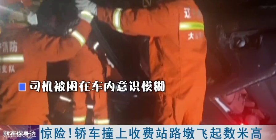 惊险!轿车撞上收费站路墩飞起数米高