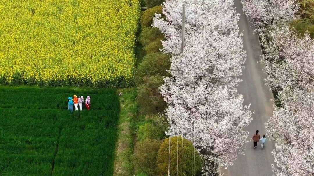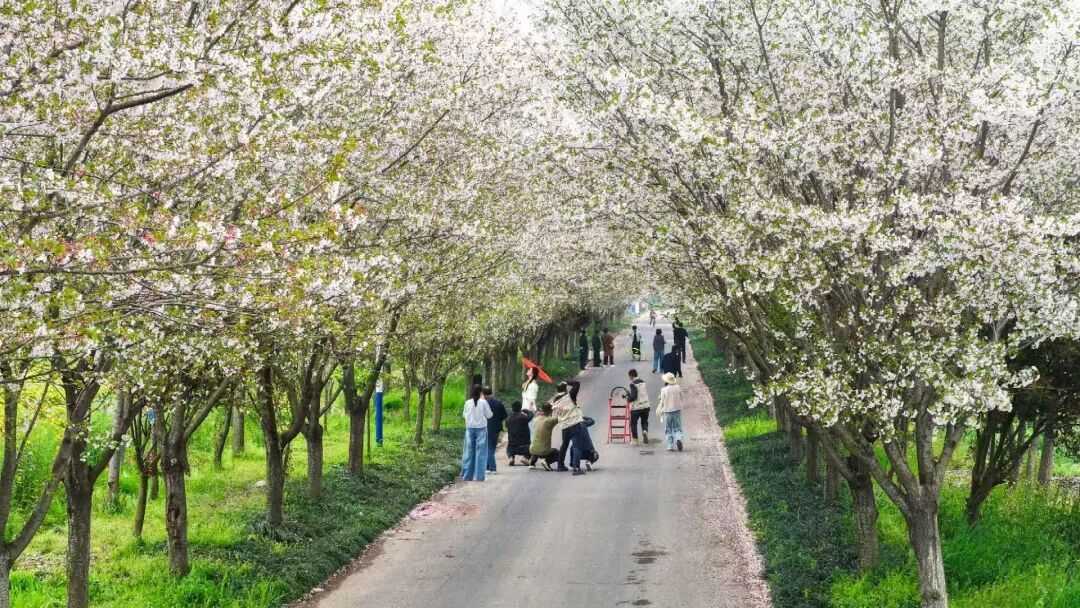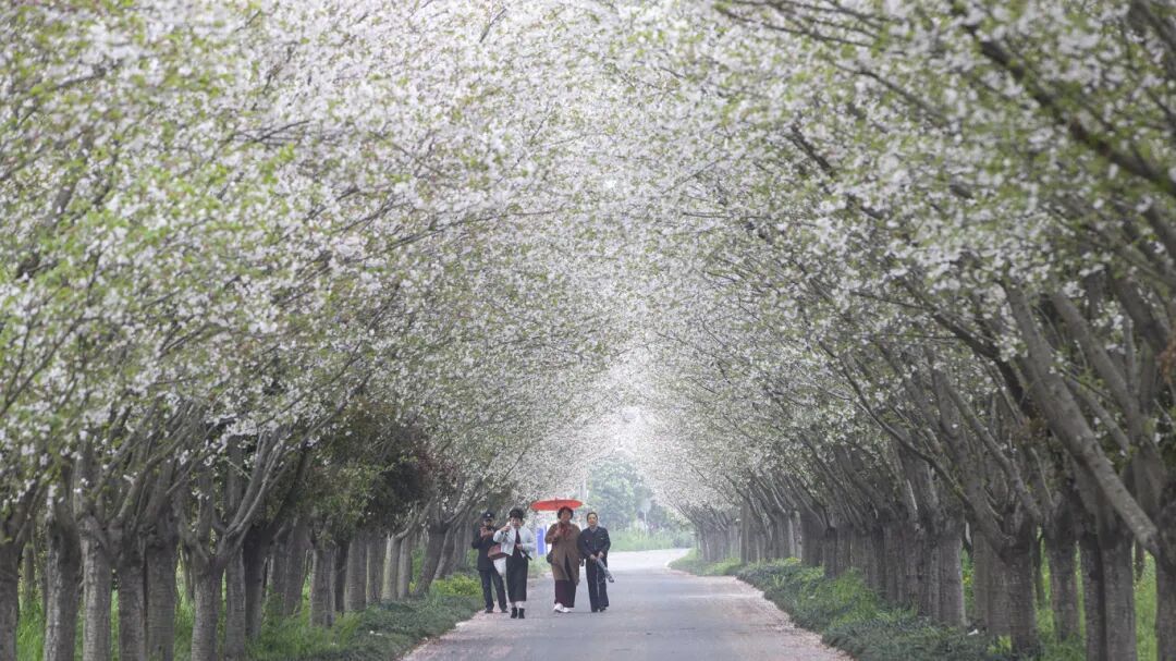 清晨的薄雾还未散尽,阳光透过层层叠叠的花瓣,洒下斑驳的光影,落在蜿蜒的村道上,落在路边的田埂间,也落在早起村民的肩头。远远望去,樱花树沿着村路一路延伸,枝桠交错,织成一条天然的粉色长廊,仿佛走进了童话世界,每一步都踩在浪漫的诗行里。