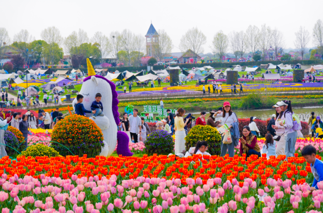4日当天,花博汇景区内,千亩花海浪漫盛放,郁金香、虞美人、二月兰、角堇、雏菊等花卉竞相吐艳,构筑起武汉春日独有的沉浸式赏花秘境。各类花海搭配观光火车、城堡、钟楼等特色景观,随手一拍都是氛围感春日大片。游客漫步花间、搭帐休憩,在花香中尽享清明踏青的闲适与惬意。