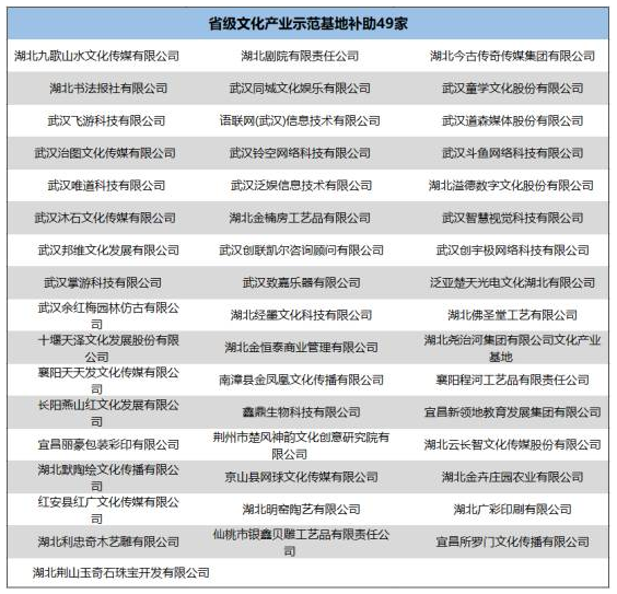 10月30日,湖北省文化厅发布《2017年度省扶持文化产业示范园区及基地发展专项资金入选单位名单公示》。公示中,“专项资金入选单位”一共有58家。其中,省级文化产业示范园区奖励9家,省级文化产业示范基地补助49家!