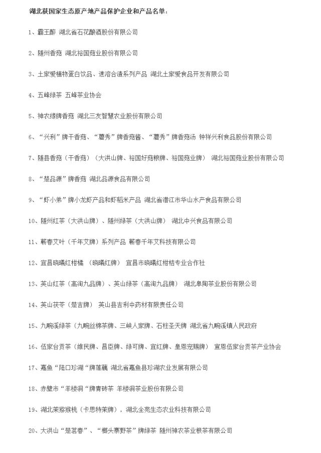 11月2日,湖北出入境检验检疫局透露,近日,国家质检总局公告一批获国家生态原产地保护的产品,本次共有85个产品,湖北有11个产品名列其中。截至目前,湖北共有20个产品获得国家生态原产地产品保护。