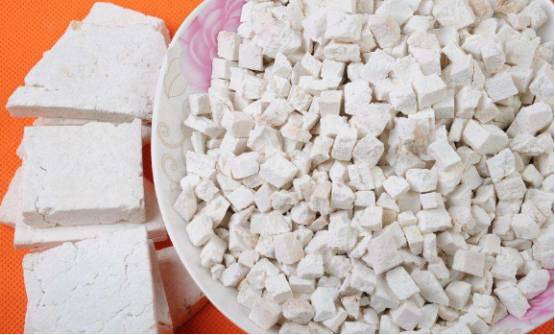 茯苓的主要成分,目前已知的有茯苓聚糖、茯苓酸、麦角甾醇、胆碱、组织氨、磷脂、蛋白质、酶等,是一种很有营养的有益健康的药品。英山茯苓以洁白匀净著称。