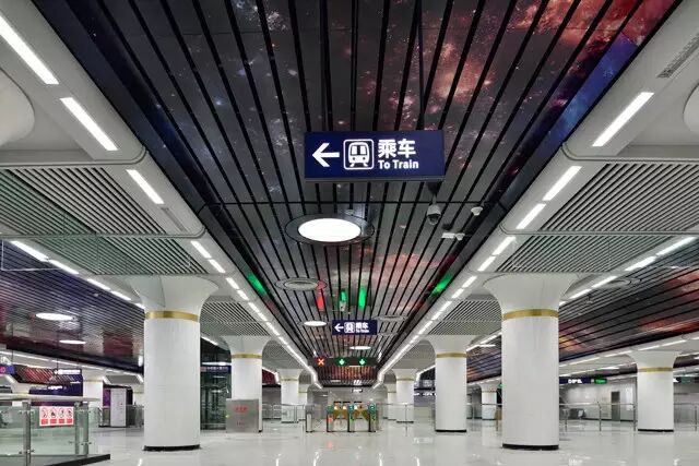 地铁站里有一面21米长、2.5米高的景观墙,墙上1.5万盏灯闪烁如银河星汉,会变幻出各种色彩的12星座的星云图,头顶是宇宙星空喷绘,没错,有种误入太空彼岸的幻觉。