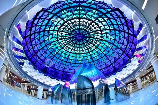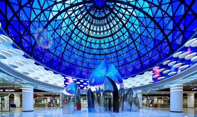 这座地铁站的头顶,是直径21米的渐变蓝色玻璃穹顶,阳光穿透,像一朵绽开的蓝莲花。在地面上看,它是一颗巨大的晶莹蓝色水晶球,像巴黎卢浮宫露出地面的玻璃金字塔。954块钢化玻璃制成,双层玻璃里注入氮气,隔热隔紫外线,能承受6500人同时站在上面。